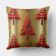 Un élégant coussin carré de Noël avec un motif de sapins rouges dressé contre un arrière - plan en or métallique pour ajouter une touche de classe festive à votre maison de noël décorant cette période de fêtes.
