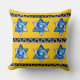Et un "Bonjour" brillant, ensoleillé pour vous ! C'est le message que vous recevrez lorsque vous parcourez somnolemment le salon pour aller à la cuisine et fixez vos yeux sur cet oreiller extra moelleux, extra moelleux, extra joyeux et très joyeux avec Leslie Sigal Javorek vitrail original bleu et blanc étoile de David; en 2 rangées de 3 étoiles séparées par des bandes d'un motif à clé gris argenté sur le noir & set sur un taxi jaune vif arrière - plan. Sur le dos est le même jaune en lui-même.