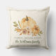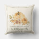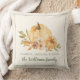 Aquarelle d'automne citrouille floral coussin avec l'expression "reconnaissant. reconnaissant. béni." qui est modifiable. Le coussin peut être personnalisé avec un nom/nom de famille en script dans un vert gris foncé. Même graphique des deux côtés du coussin.
