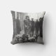 Détendez-vous avec cet oreiller iconique représentant une image vintage en noir et blanc d'un promeneur de chiens avec un groupe de bouledogues français en ville.