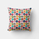 Cet oreiller de lancer a un design moderne du milieu du siècle de demi-cercles rayés et de demi-cercles solides assemblés sur un champ de blanc.