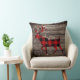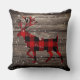 Un cabine de bois d'hiver à thème lancer l'oreiller avec un arrière - plan de la grange de bois récupéré avec un renne de cerf à motif de buffle rouge sous un léger poussif de neige. L'arrière comporte un petit motif de répétition du même grand cerf.