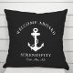 Un coussin moderne chic sur le thème nautique pour votre bateau qui présente une illustration blanche d'une ancre sur un arrière - plan noir. Vous pouvez personnaliser le texte "Welcome Aboard" ainsi que le nom et l'emplacement de votre bateau dans une typographie blanche moderne.