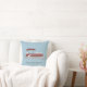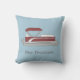 Cet oreiller est prêt à être customisé avec le nom de votre bateau ou tout autre texte personnalisé. Il présente une illustration d'un ponton en rouge aux accents blancs, avec votre texte en lettres grises contre un arrière - plan bleu clair.