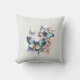 Un coussin avec un trio de papillons flottant parmi de jolies fleurs. Couleurs bleu rose et vert.