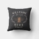 Bienvenue aux invités avec ce mignon oreiller à thème d'abeilles avec une illustration d'abeilles de style vintage ornée de détails de feuilles botaniques. "Bienvenue dans notre ruche" apparaît en lettrage ivoire. Personnalisez avec votre nom de famille le long du bas.