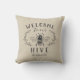 Bienvenue aux invités avec ce mignon oreiller à thème d'abeilles avec une illustration d'abeilles de style vintage ornée de détails de feuilles botaniques. "Bienvenue dans notre ruche" apparaît en lettres de charbon. Personnalisez avec votre nom de famille le long du bas.
