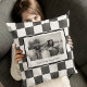 This pillow is ready to be customized with your own photo and your own custom caption. Your photo and caption are set inside of a black and white frame against a black and white checkerboard background. Nearly black squares with a painted look and plain white squares are arranged in an alternating pattern on the front and back of this throw pillow.