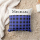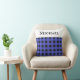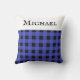Coussin design pour un lit, une chaise ou un canapé, à motif de buffle en bleu et noir. En haut se trouve un groupe blanc, avec le nom que vous avez choisi en lettres majuscules noires. Le coussin à baldaquin fait un cadeau sur mesure élégant pour les amis, la famille et les collègues, à Noël et toute l'année.