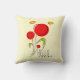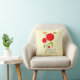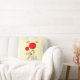 Coussin qui dit : Bonjour le printemps. Conçu avec un dessin charmant de plusieurs fleurs rouges fantaisistes avec des coeurs gras attachés à une tige verte. 2 papillons jaunes planent à proximité. Dessiné avec un contour noir.