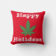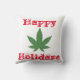 Happy Holidaze jette l'oreiller. Personnalisable et réversible. Grandes feuilles de mauvaises herbes vertes avec arrière - plan rouge et texte blanc proclamant, "Happy Holidaze" d'un côté et arrière - plan blanc et texte rouge de l'autre. Vous pouvez personnaliser à votre goût en changeant la couleur arrière - plan, le type de coussin, le texte ou l'image.