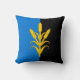 "Par pâle azure et sable, une tige de trois cattails glissait et sortait ou." Insigne populaire pour la baronnie de Saint Sin's Bog dans la Société pour l'anachronisme créatif. Le dos du coussin est un motif en alliage dans la coordination des couleurs.