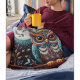 Ce design coloré présente une chouette chouette bleu aqua assise sur une branche d'arbre avec la lune et les étoiles dans l'arrière - plan, le tout sur un arrière - plan bleu marine.