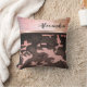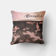 Sur ce coussin élégant est une texture en verre dépoli rose chatoyant avec un ruban rose et noir où au-dessus, vous pouvez le personnaliser pour le rendre unique à vous et en dessous, c'est un motif de camouflage rose et marron pour le contraste. Des vibes chic branchées.