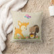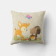 Un coussin avec une jolie illustration montrant un cerf de bébé et un petit écureuil tenant une glande et un papillon volant au-dessus de leur tête. Ces adorables créatures boisées se tiennent debout sur une herbe avec quelques champignons fantaisistes à leurs pieds. L'Arrière - plan a un look de papier kraft brun.