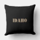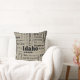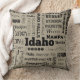 Un coussin avec du charme comportant le nom d'état de l'Idaho et certaines de ses villes et villes en texte noir des polices variables et tailles sur un taupe/arrière - plan gris. Le dos est noir solide avec le mot "Idaho" dans le taupe. Renversez juste le coussin pour changer rapidement le regard de votre pièce.