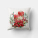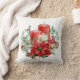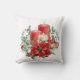 Coussin avec un joli bouquet en aquarelles. Bougies rouges aux accents dorés et bougie blanche plus petite aussi. Entouré d'un bouquet de pins avec une fleur de poinsettia.