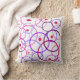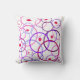 Cet oreiller décoratif de lancer présente un motif géométrique lunatique de répétition, des cercles se chevauchant dans les tons rose, bleu, violet et magenta sur un arrière - plan blanc. De petits cercles rouges sont éparpillés un peu partout.