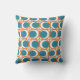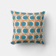 Cet oreiller de lancer a un design moderne du milieu du siècle de cercles orange ouvert avec des cercles turquoises solides qui traversent le motif avec des lignes verticales turquoises et des lignes horizontales orange.