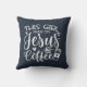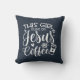 Cette fille tourne sur Jésus et coussin bleu café en écriture décorative blanche avec tasse de café et détails du coeur.