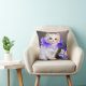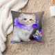 Coussin avec un chaton blanc magnifique ! Un chaton moelleux porte un collier de fleurs violettes. Un bol bleu de fleurs blanches et violettes se trouve à droite. Un cadeau merveilleux pour les amoureux de les chats et les amateurs d'art victorien !