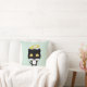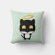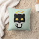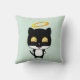 Un coussin avec un mignon chat kitty d'ange noir et blanc avec un halo doré au-dessus de sa tête, dessiné dans le style dessin animé. Arrière - plan vert pastel.