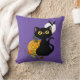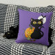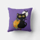 Un mignon chat noir avec un citrouille orange, chauve-souris, glands et une pleine lune sur fond de violet