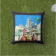 Jetez un oreiller dans une illustration de trois chats coquets, habillés comme des touristes devant un paysage urbain futuriste. L'architecture évoque l'esthétique de la science-fiction du milieu du siècle. Les chats tiennent des caméras, des cartes et portent des lanières, suggérant l'aventure. Des palmiers et un ciel bleu vif agrémentent l'atmosphère de vacances.