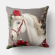 Un cheval élégant porte un chapeau de Père Noël rouge et une halte festive au milieu de décorations sur le thème des vacances, avec verdure, ornements rouges et flocons de neige, évoquant l'esprit chaleureux de la saison de Noël.