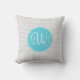 Ce coussin a un motif gris de chevron à l'arrière-plan avec un cercle bleu et un monogramme de trois lettres au centre.