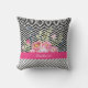 Un carré floral rose chic jette l'oreiller avec un arrière - plan motif en chevron noir et blanc branché sur le dessus et des bandes diagonales grises et blanches sur le fond. Faites-le uniquement le vôtre en ajoutant votre nom à la bande rose chaude ceinturée.