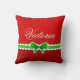 Beau oreiller festif à lancer rouge avec arc vert et texte personnalisé.