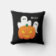 Un oreiller jetable pour votre décor d'Halloween à la maison, qui saisit l'essence de la saison avec un délicieux citrouille éclairé entouré de fantômes ludiques, le tout s'exclamant joyeusement, Boo !