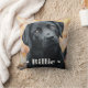 Jetez un oreiller avec votre photo d'animal de compagnie personnalisée avec le nom de l'animal comme un texte blanc superposé flanqué de deux coeurs.