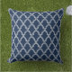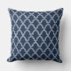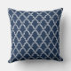 Cet oreiller extérieur à l'accent jeté est montré avec une belle marine et blanc imprimé marocain design.
