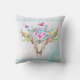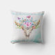 Une coussin carré avec un arrière - plan turquoise et pastel. Un crâne animal chic boho avec un bouquet floral sur la tête et des petits papillons qui fleurissent. Une jolie bordure décorative aux petites teardrop en bleu clair.