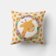 Un coussin avec l'illustration d'un joli visage de girafe souriant, entouré d'une couronne de fleurs tropicales d'aquarelle. Coloré et mignon. Arrière - plan est un motif avec des taches oranges.