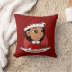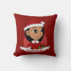 Throw pillow with an illustration of a cute little happy smiling Latina/Hispanic or Asian girl with long black hair, who is dressed in Christmas clothes and is wearing a red Santa Claus hat and holding a present; Christmas holidays design on a red background, with an editable text template for your name or message