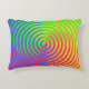 Voici un coussin coloré avec un motif arc-en-ciel en spirale abstrait tourbillonnant autour d'une cible centrale dans les couleurs vert, bleu, jaune, orange et rouge.
