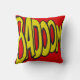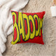 Sur ce coussin bande-inspiré comique le mot "badoom !" est sélectionné en jaune lumineux au-dessus d'un arrière - plan rouge vibrant. Un effet subtil de mezzotinto est la couche de finition au-dessus du morceau entier.