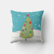 Coussin des arbres de Noël, des arbres de Noël dessinés à la main et des neiges. Devant du coussin est 4 arbres capricieux en turquoise, vert, rose et crème debout sur des montagnes de neige avec un arrière - plan neigeux bleu. Le dos du coussin est un arbre vert solitaire dans la coordination des couleurs. L'avant du dos du coussin est numériquement signé par l'artiste : g.gabel. *Tous les graphismes de Gail Gabel, artiste.