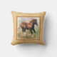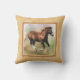 Un carreau ou un coussin carré avec un cadre de frontière aux nuances de bronzage beige et léger, avec une peinture numérique d'un poulain avançant à petit galop de cheval de trait d'oseille sur un pastel a coloré l'arrière - plan.