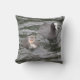 Ce coussin impressionnant présente une photo d'une Pied et de sa nage de poussin sur une rivière marémotrice. La femelle est grise avec un patch blanc sur la tête et les yeux rouges, tandis que la petite poussette moelleuse est gris pâle avec un front blanc.