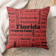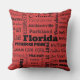 Les coussins décoratifs sont une manière élégante d'ajouter la personnalité à n'importe quelle maison. Celui-ci montre un collage des noms des villes populaires dans Floride dans le noir sur le rouge de rouge à lèvres, et le dos est noir solide.