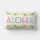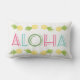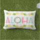 Bienvenue dans notre maison avec un design coussin de style tropical qui présente une typographie colorée "Aloha" et une frontière festive d'ananas jaune. Comprend le rose vif, le bleu aqua, le vert feuille, le jaune soleil et le blanc.