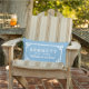 Le design élégant du coussin lombaire comprend un cadre géométrique clé grecque blanche et un monogramme qui peut être personnalisé avec un nom de famille ou un nom de famille, date de l'année établie (peut être l'année mariée ou l'année de naissance du premier enfant). Customisez l'arrière - plan bleu ciel / poudreuse pour coordonner avec votre décor extérieur.
