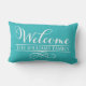 Le design élégant des coussins extérieurs dispose de "Welcome" dans l'écriture moderne en écriture blanche avec le texte de nom de famille personnalisé et l'accent décoratif de défilement. La couleur bleu turquoise de l'arrière - plan que l'on customise à harmoniser avec la décoration.