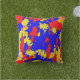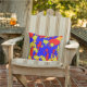 Ce coussin extérieur coloré comporte un motif abstrait des éclaboussures de peinture en rouge, bleu, jaune et l'orange.