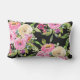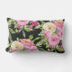 Des roses d'aquarelle luxuriants dans les tons rose, rouge, pêche et crème fleurissent sur un arrière - plan noir sur cet oreiller féminin.
