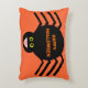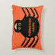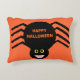 Ce coussin impressionnant présente une araignée noire éffrayante avec huit pattes poilues, des yeux jaunes avec de grands élèves noirs et sa bouche ouverte montrant ses crocs. Il y a un texte orange qui dit "Happy Halloween" et un arrière - plan orange correspondant.